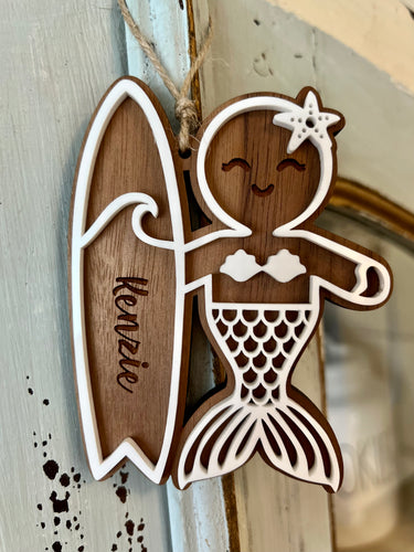 These beachy style gingerbread ornaments are laser cut and engraved from walnut and white acrylic. They have the option for personalization so please read each listing and follow the directions if you’d like them engraved. Size varies depending on style.