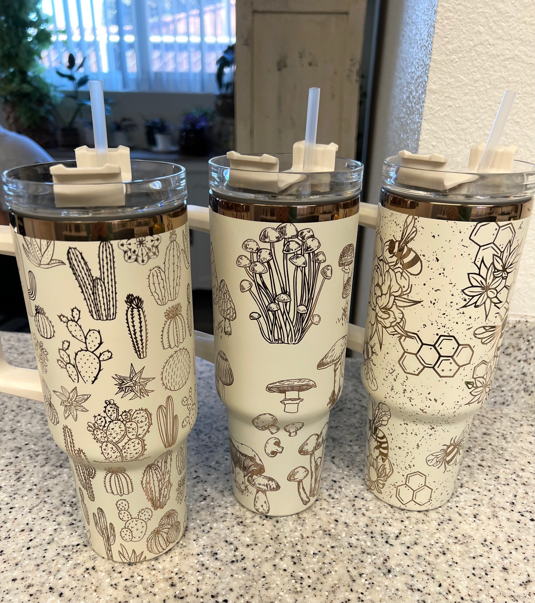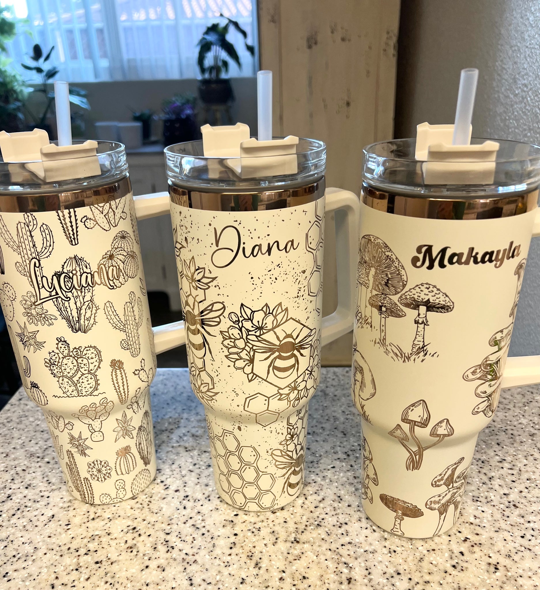 Here are just a few of the options I have for engraved tumblers. These are cream 40 oz tumblers that engrave to reveal a beautiful copper color! If you would like your tumbler customized with a name, please note that in the text box at checkout. Unless otherwise noted, all tumblers will come engraved with images but no name customization. If you don’t see a design you like, email me so we can work together to come up with something that works for you!