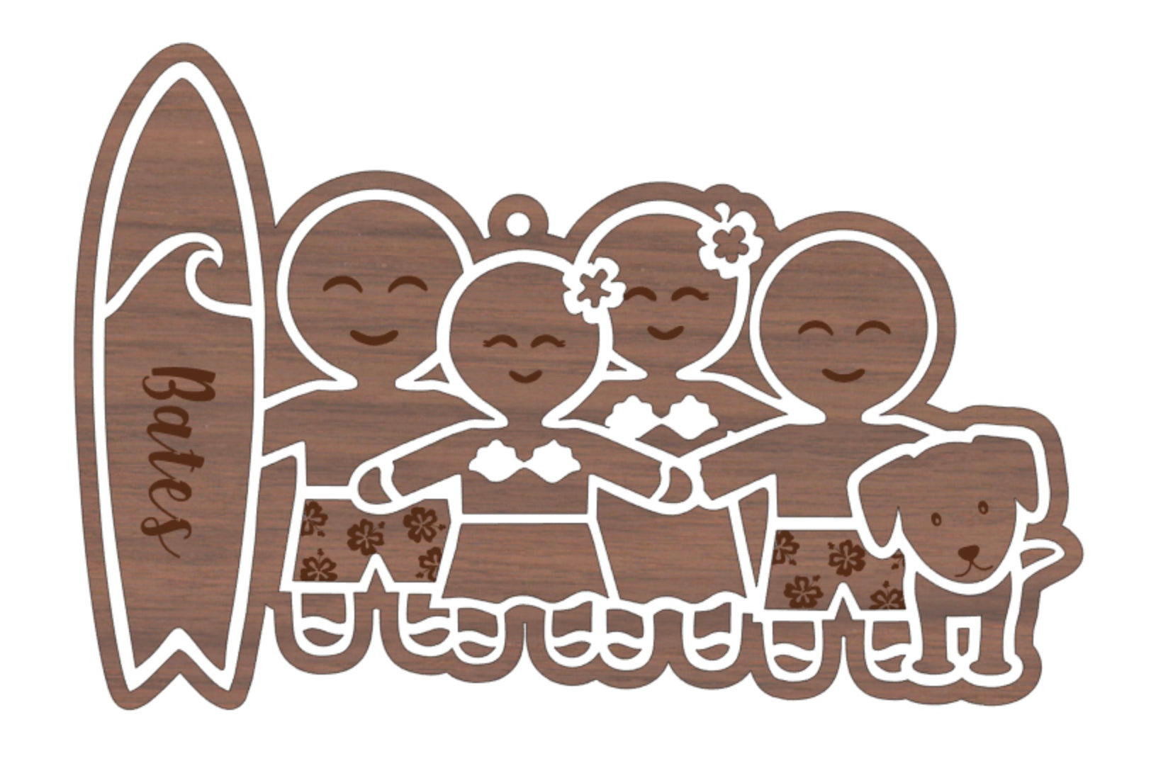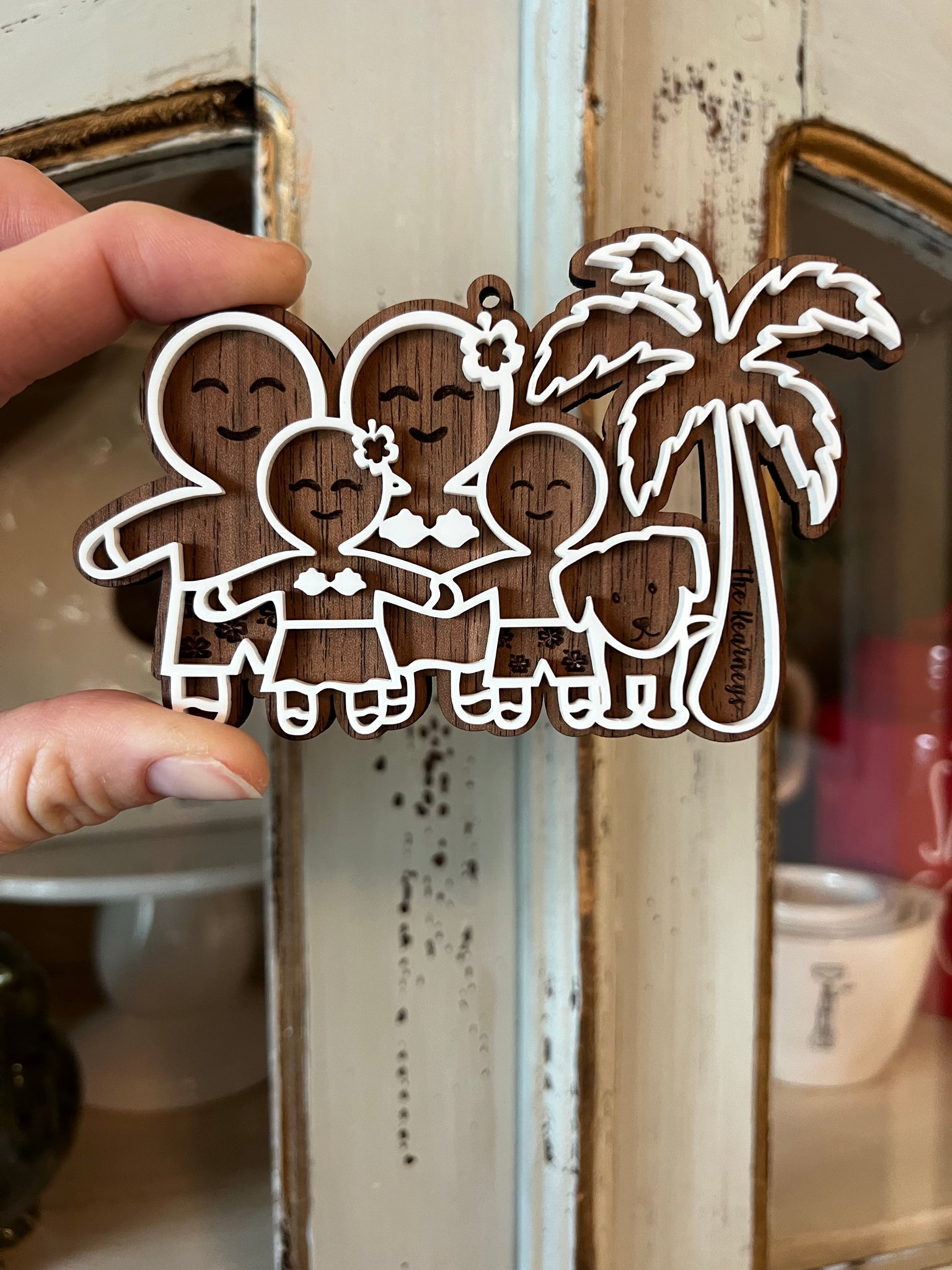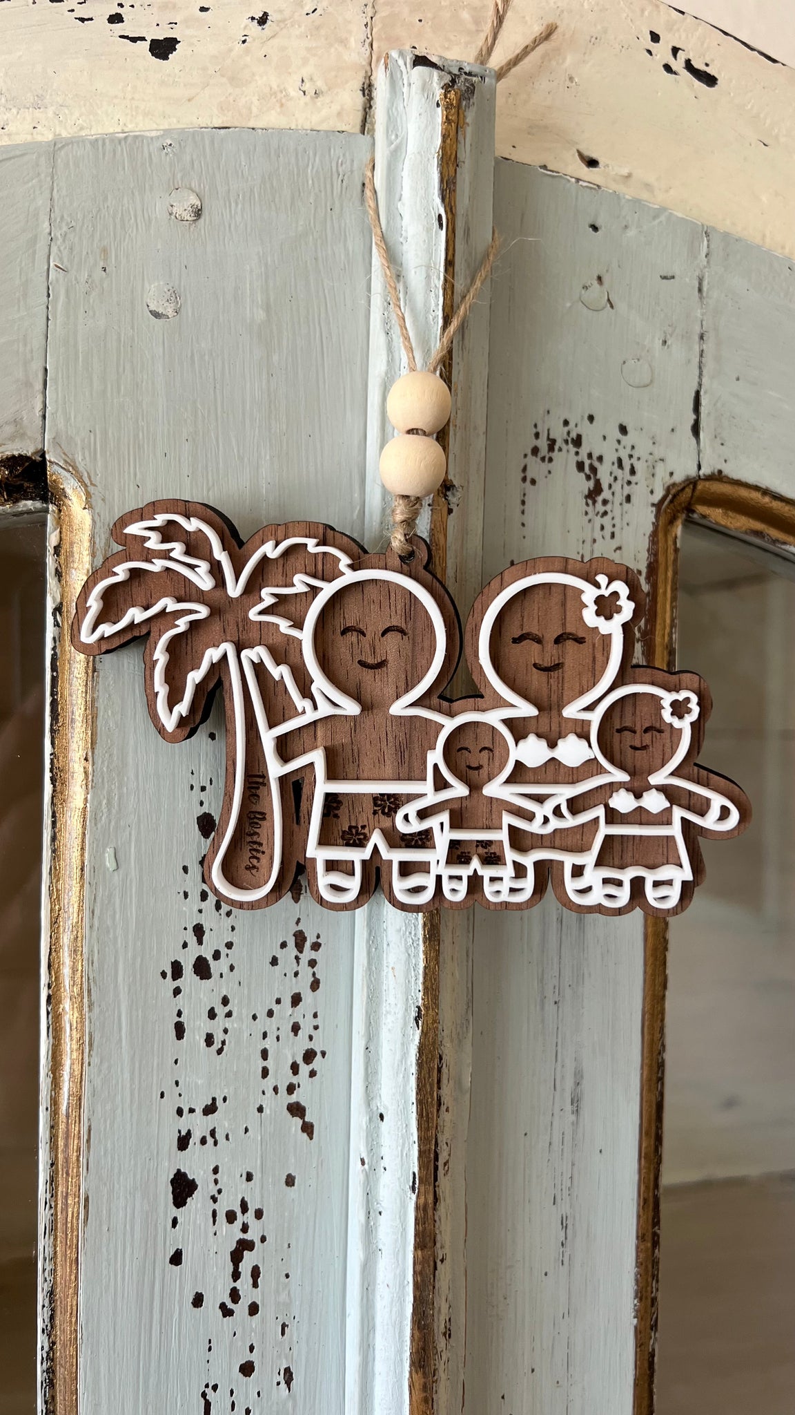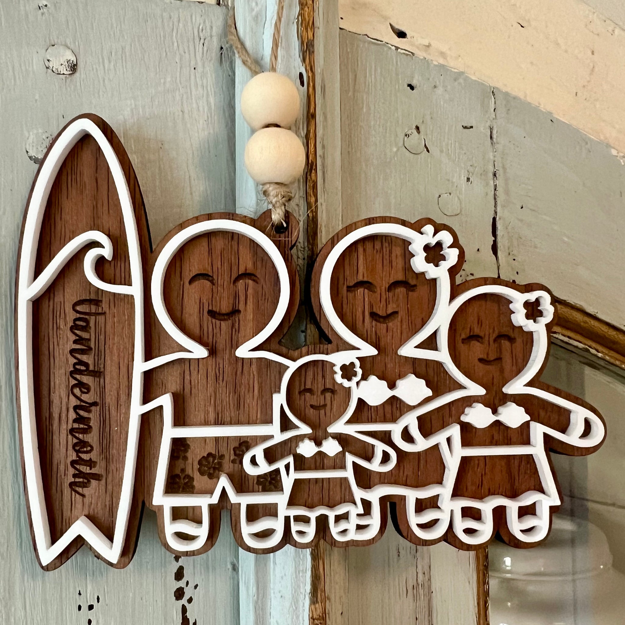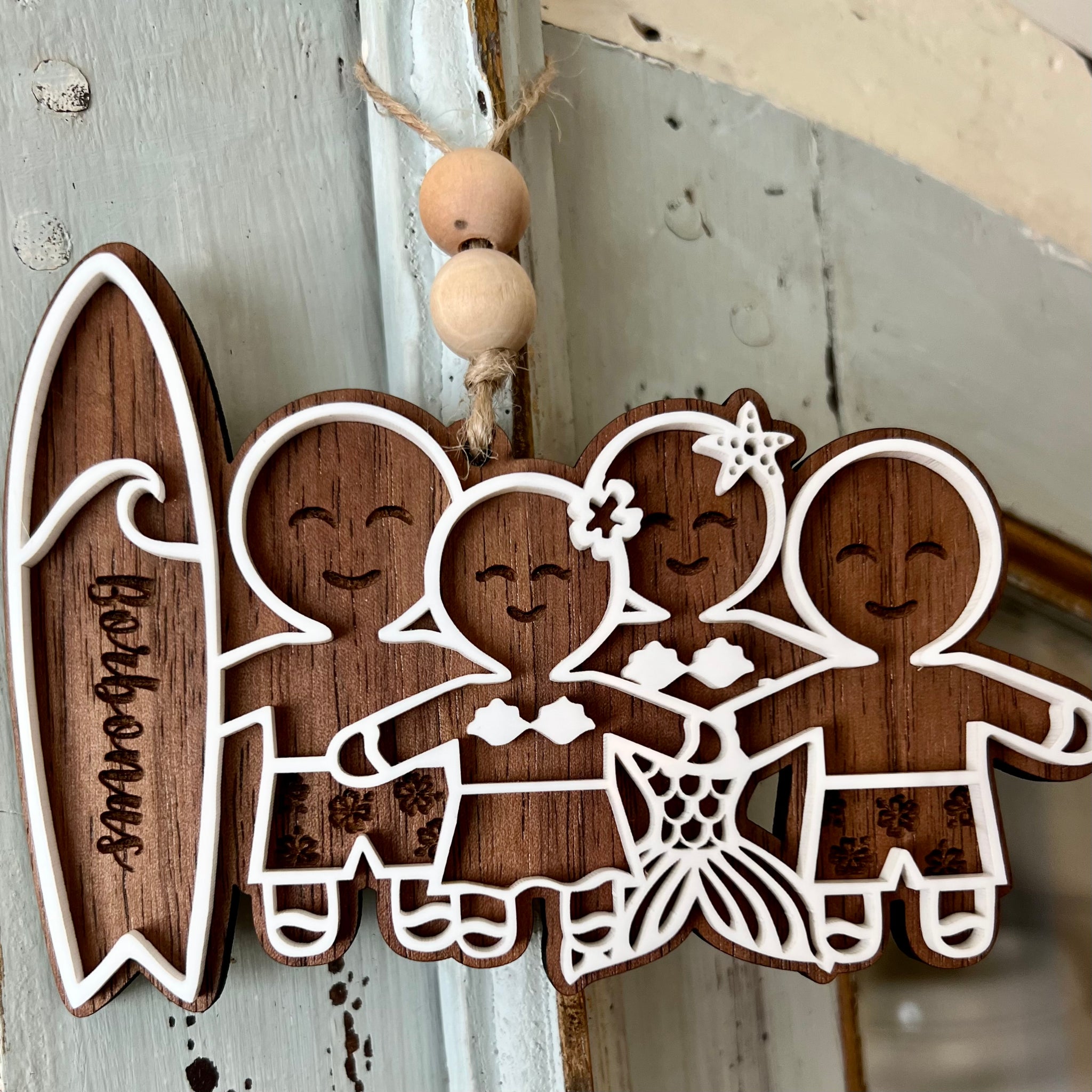 These adorable custom gingerbread family ornaments are made from walnut veneered mdf and white acrylic. They come ready to hang with twine and decorative beads. They range from 3”-6” wide depending on family size.