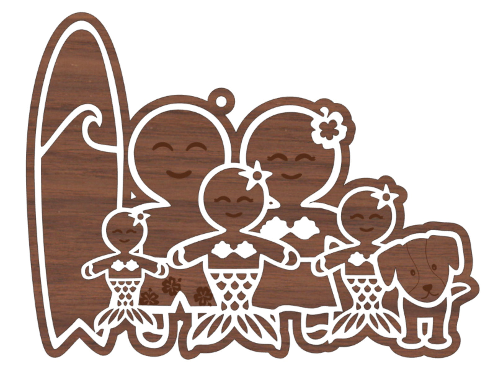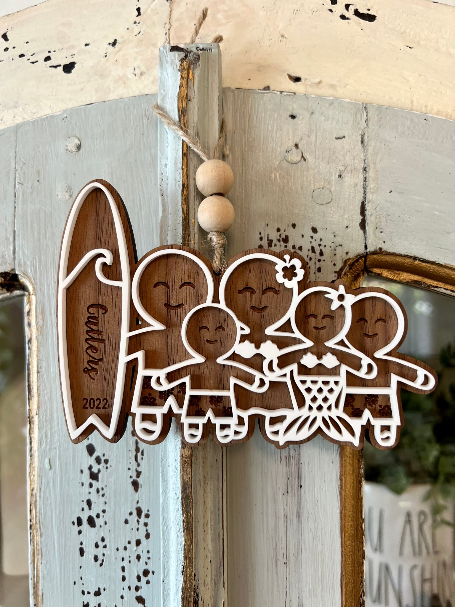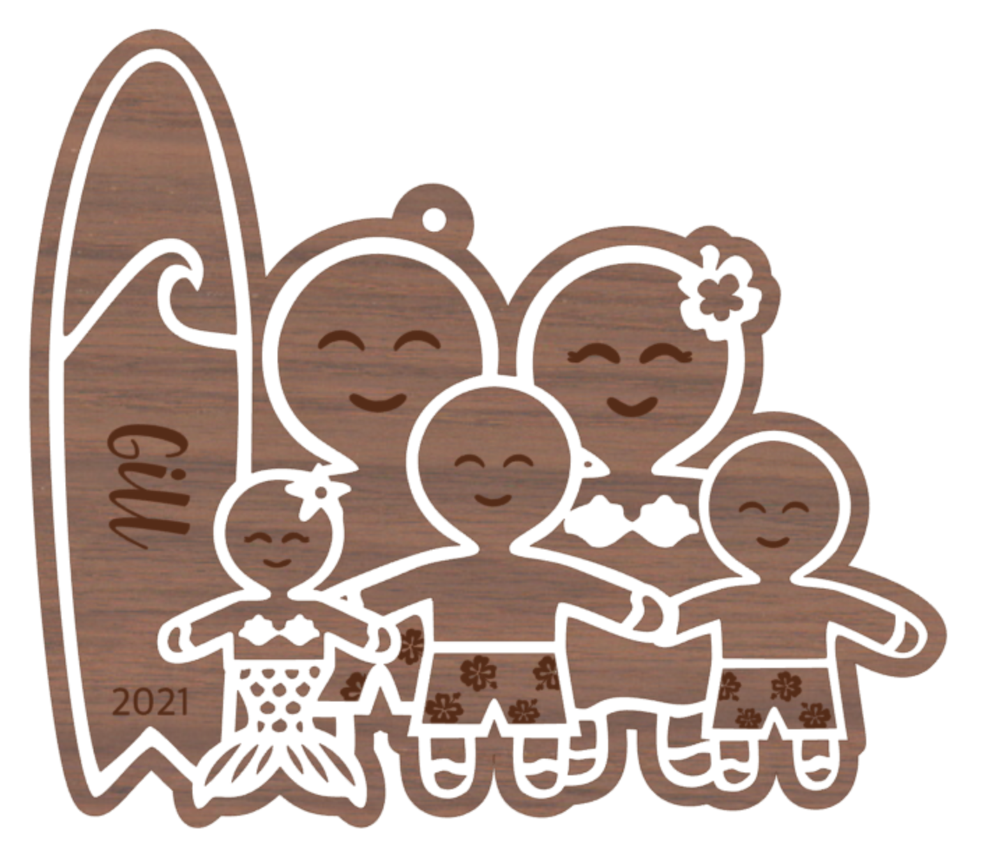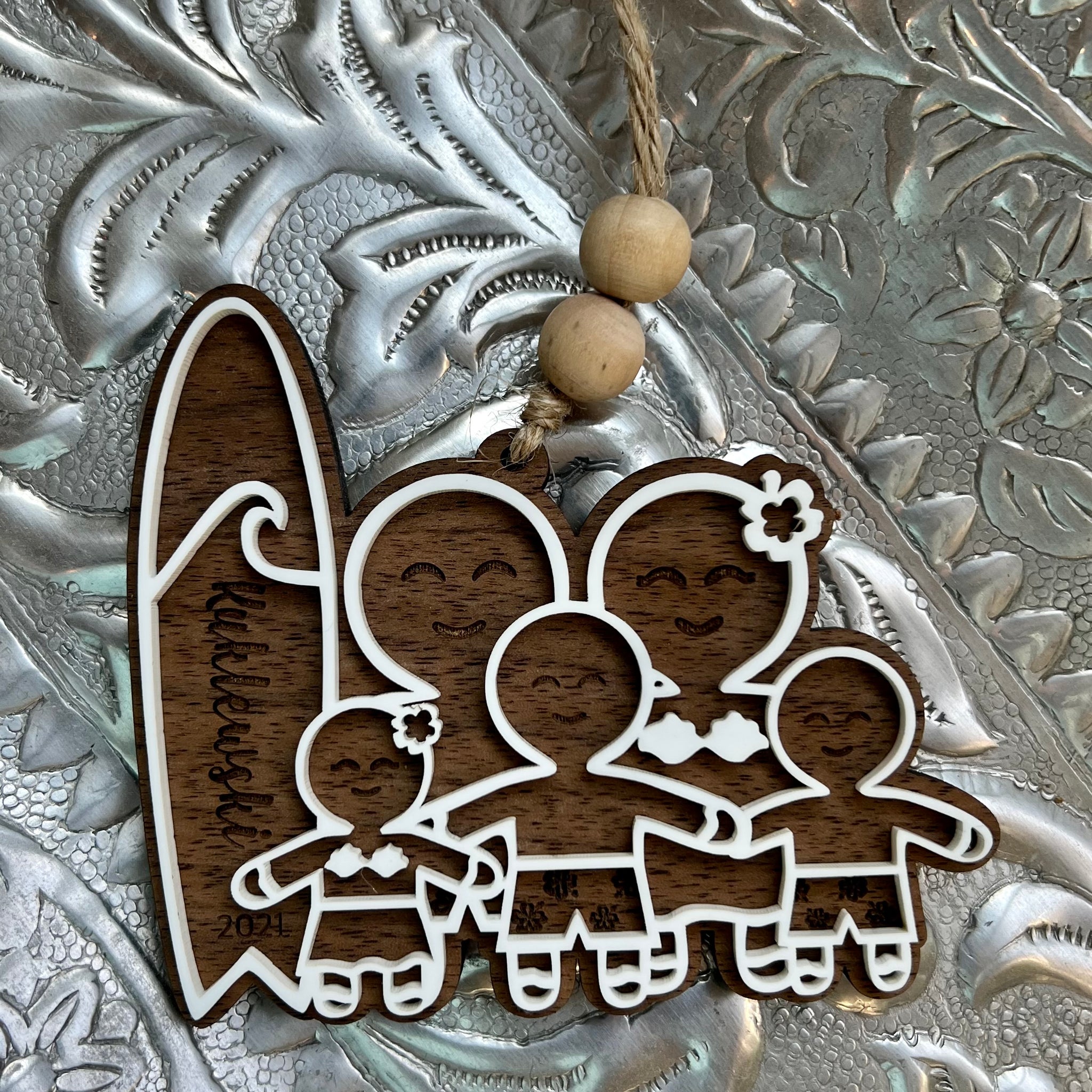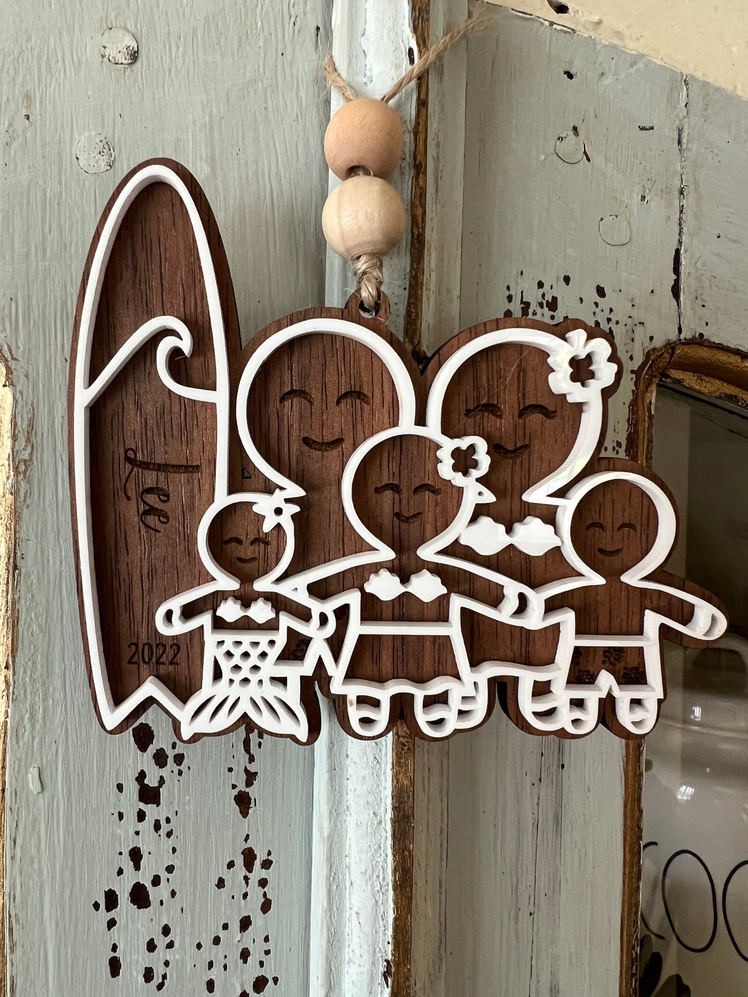 These adorable custom gingerbread family ornaments are made from walnut veneered mdf and white acrylic. They come ready to hang with twine and decorative beads. They range from 3”-6” wide depending on family size.