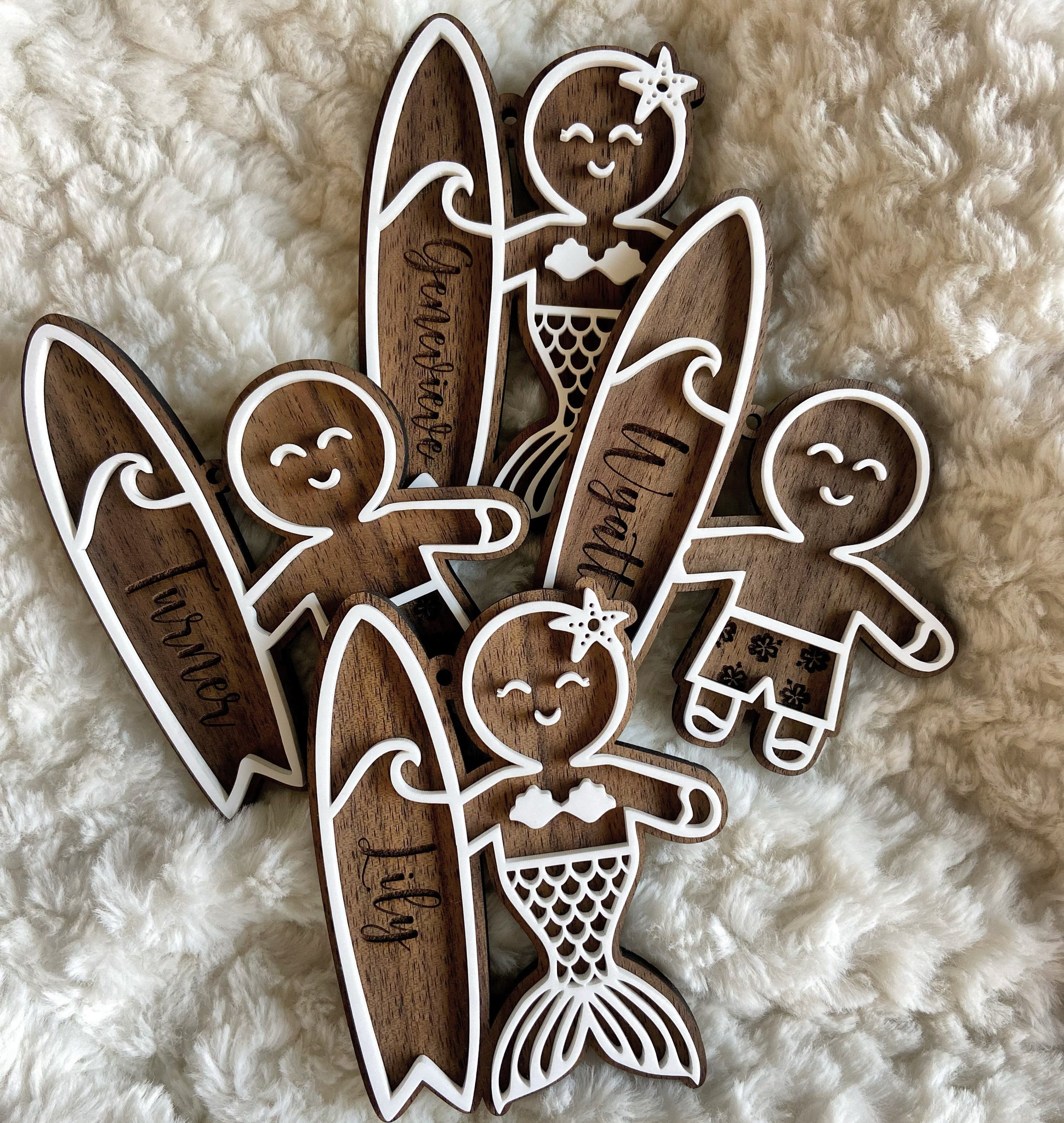 This gingerbread boy SUP ornament is laser cut from 1/4” walnut and 1/8” white acrylic. The back comes unfinished. Choose from inside the surfboard or the backside of the ornament for engraved personalization. The second and third photo shows personalized options. Measures approximately 4” tall and a twine hanger will be included.