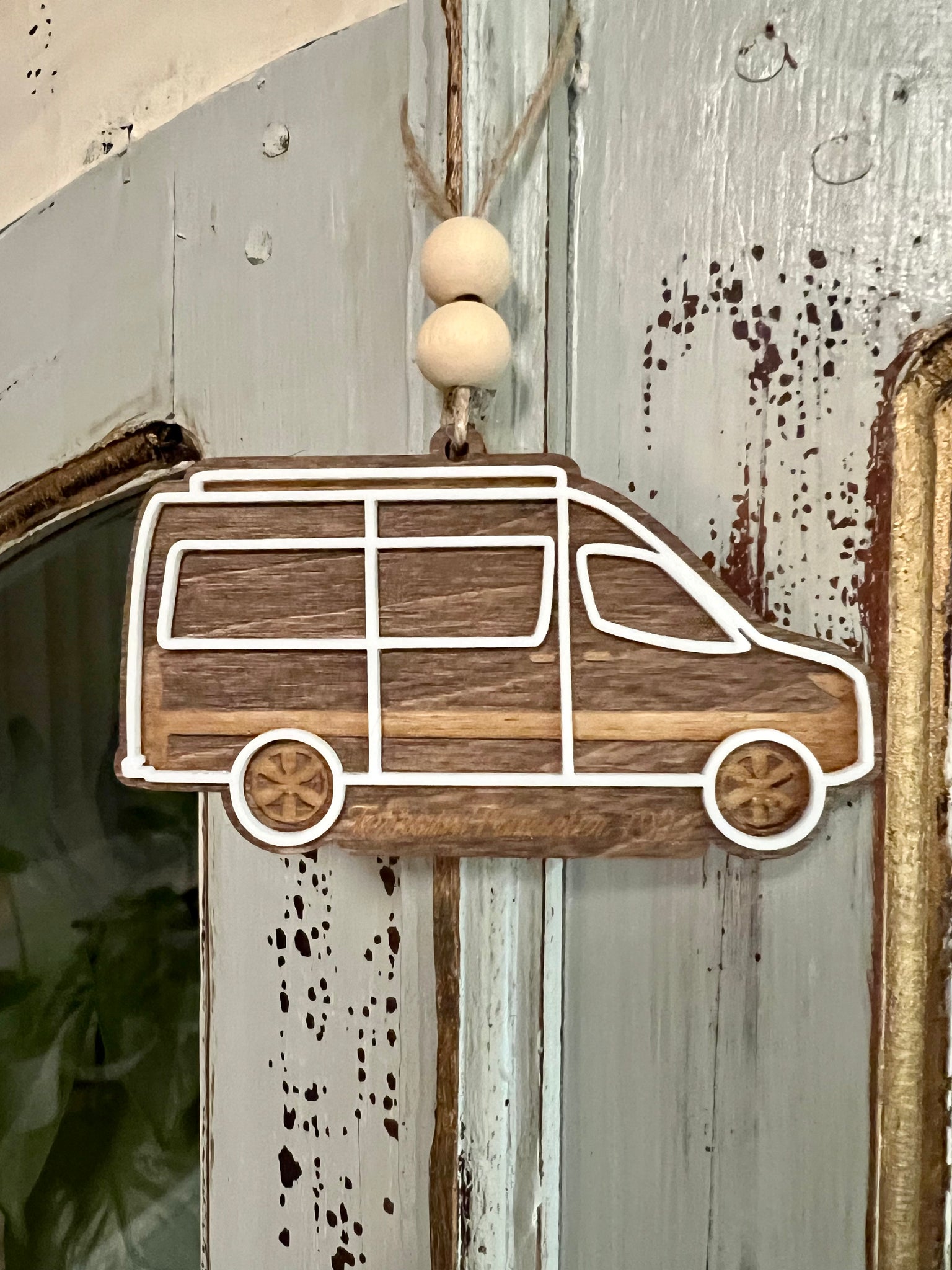 These adorable custom gingerbread style camper van ornament is made from stained baltic birch wood and white acrylic. They come ready to hang with twine and decorative beads. They are approximately 3.75” wide and 2” tall.